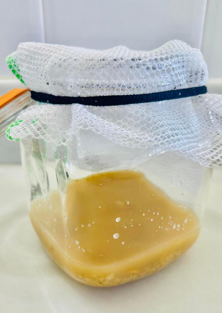 Add all the ingredients to a clean glass jar. Cover with a breathable cloth or gauze secured with a rubber band (do not use an airtight lid at this stage — the microbes need to breathe).